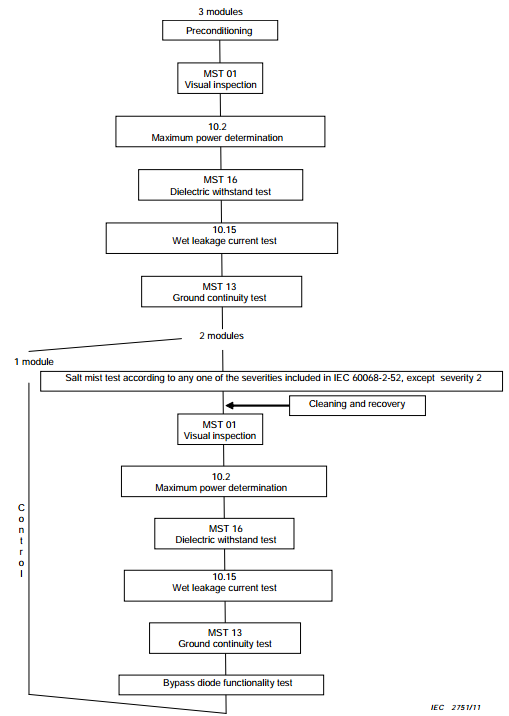 測(cè)試序列:如下圖所示,包含了IEC61215標(biāo)準(zhǔn)中的最大功率確定、濕漏電流試驗(yàn)和IEC61730-2中的外觀檢查、絕緣耐壓試驗(yàn)、接地連續(xù)性試驗(yàn),需要注意的是鹽霧試驗(yàn)后的二極管功能性測(cè)試也不能遺漏。